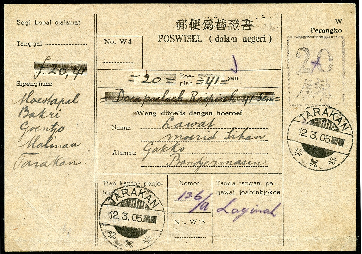 Postage Paid mark '20 + 2 kanji's' in bluish black from the second period Bu.JB75 type D on M.O. Bu.JF44a from Tarakan 12.3.05 to Bandjermasin (no pmk on the back)