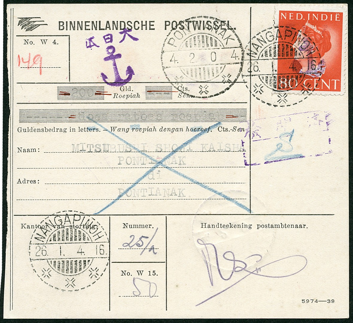 80 Cent van Konijnenburg with violet anchor overprint no. 41v-53k on M.O. Bu.JF41a showing violet anchor overprint 41v from the small sub-post office of Nangapinoh 26.1.4.16 to Pontianak 4.2.04. Censor Bu.JC4 in violet from Pontianak. Ex Mattern