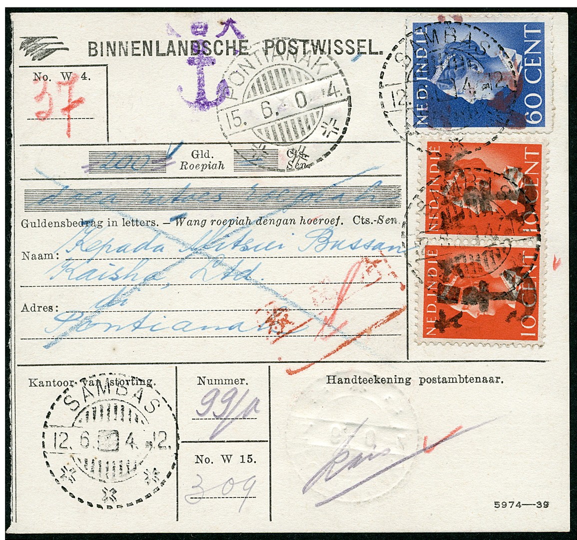 10 Cent van Konijnenburg with black anchor overprint no. 41z-43" in pair and 60 cent with brownish lilac anchor overprint (showing parts of overprints from the neighbour stamps) no. 41r-52k on M.O. Bu.JF41a showing violet large anchor overprint 41v from Sambas 12.6.4.12 to Pontianak 15.6.04. Censor Bu.JC4 in red from Pontianak. Ex Mattern