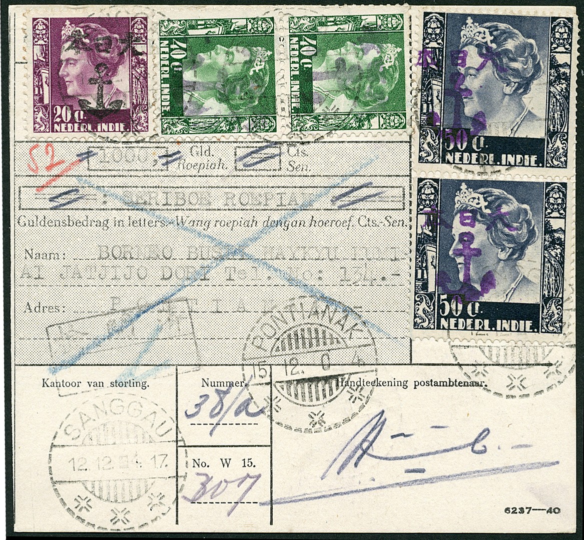 20 Cent Kreisler with black anchor overprint no. 42z-27b, 40 cent and 50 cent both with violet anchor overprint nos. 41v-32b in pair and 41v-34a in pair on M.O. Bu.JF41a from Sanggau 12.12.4.17 to Pontianak 15.12.04. Censor Bu.JC4 in black from Pontianak. Ex Mattern
