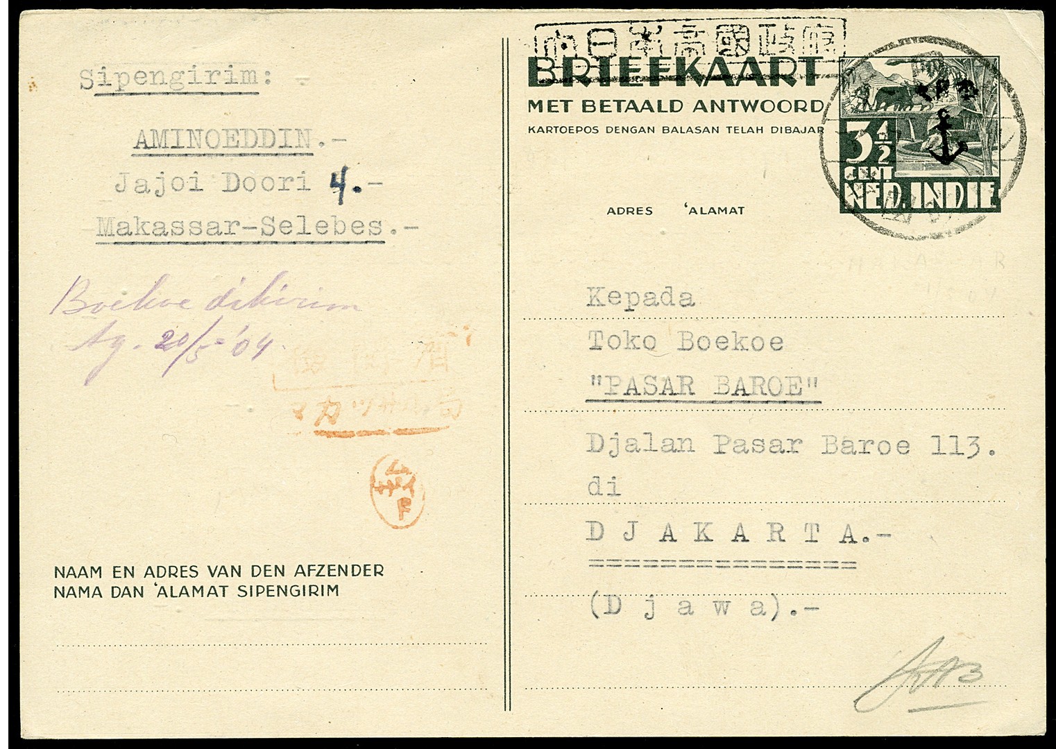 3½ CENT REPLYCARD (IN FACT THE OUTWARD CARD) IN OFFSET PRINT WITH ANCHOR OVERPRINT AND SEVEN CHARACTERS IN FRAME, TYPE SIMILAR TO Bu.236a, HOWEVER REPLYCARD NOT RECORDED, WRITTEN ON 2-5-2604 AND SENT FROM MAKASSER (TYPE 300) TO DJAKARTA (JAVA). CENSOR Vr.212a FROM MAKASSER. THE WRITER ORDERED A BOOK WHICH WAS SHIPPED TO HIM FROM DJAKARTA ON '20/5-'04'. A VERY RARE POSTCARD