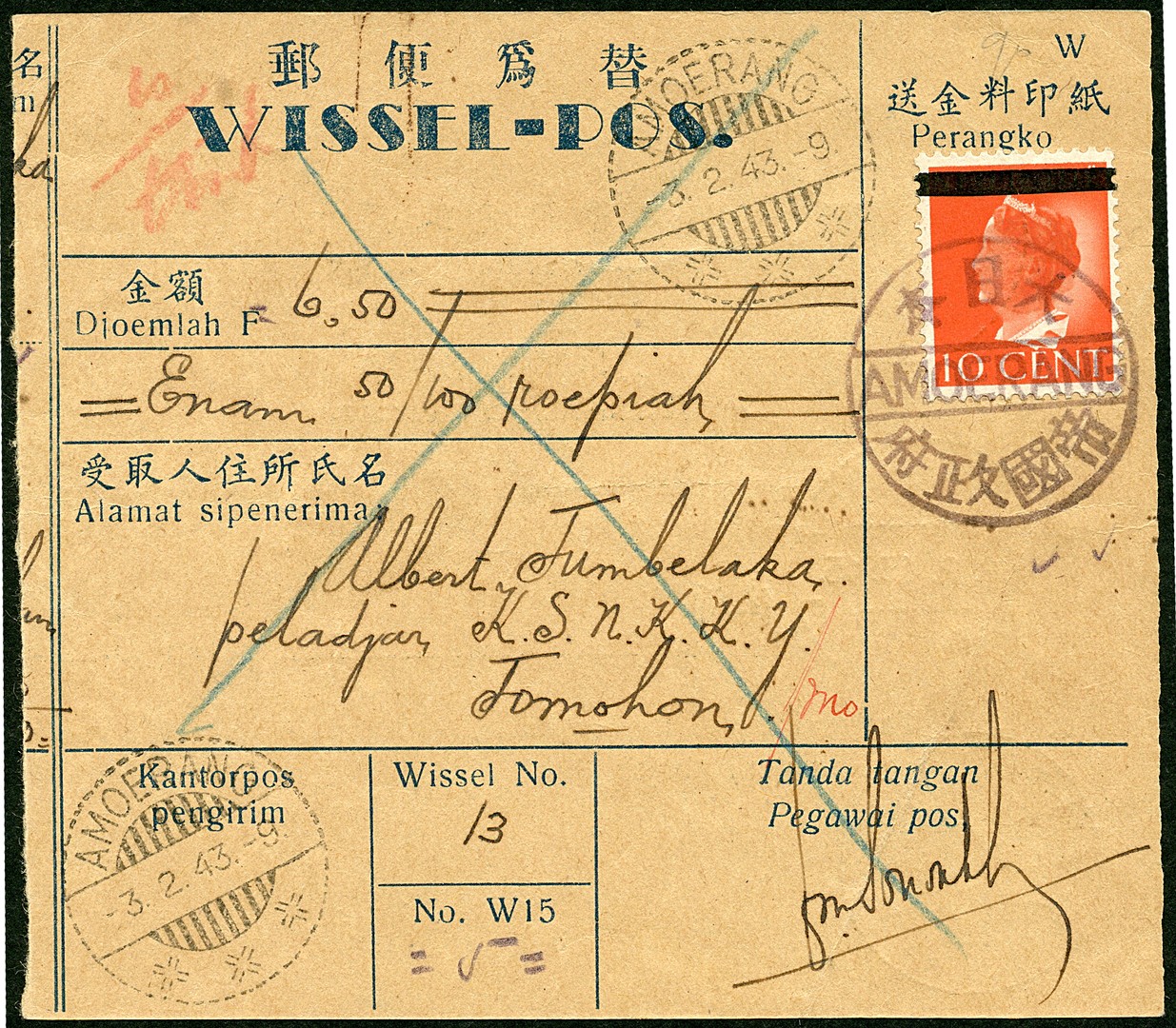 10 Cent van Konijnenburg with orange disc and black bar no. 71o-43" on M.O. Bu.JF45 cancelled AMOERANG (type 310) and sent on -3.2.43.-9 to Tomohon 5.2.43.17. Very rare postmark (vNV.RR). Ex Mattern