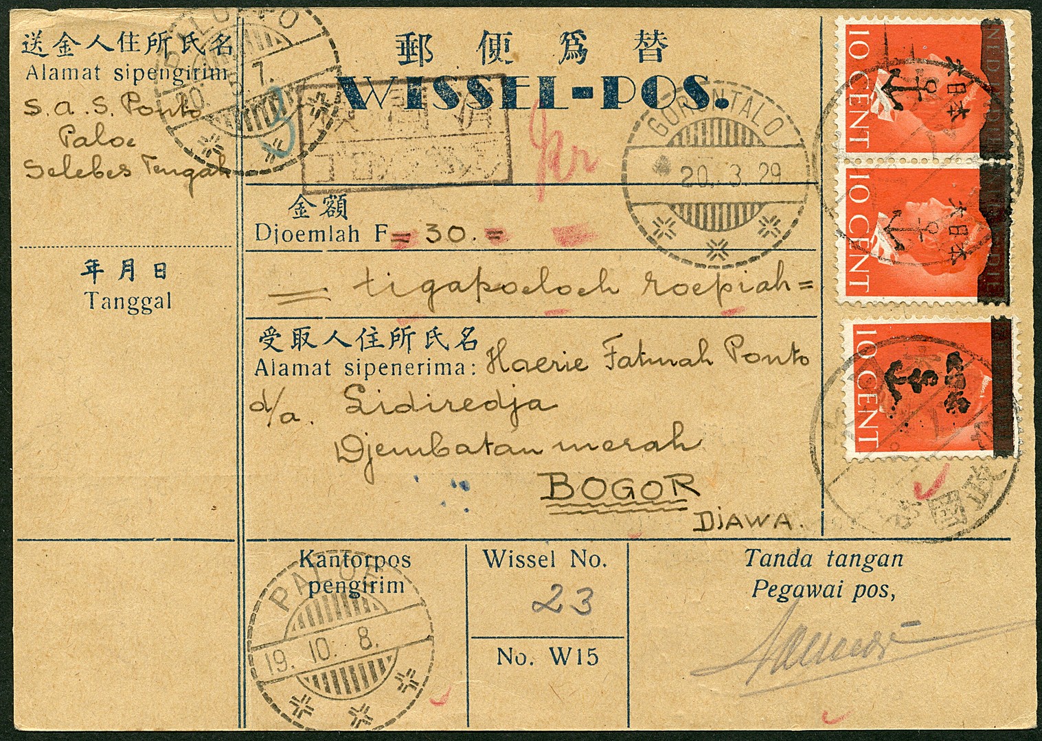 10 Cent van Konijnenburg with red disc, anchor en wide black bar 72r/12z-43" (pair and single) on complete M.O. Bu.JF45 (crease) from Paloe (type 300) on 19.10.8 via Gorontalo 20.3.29 and Paloppo 20.5.7 to Bogor (Java) 17.6.05. Censor Bu.JC3a from Gorontalo