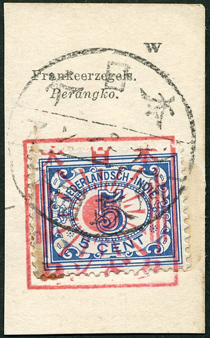 5 Cent numeral with radiating sun overprint, an emergency issue used on Lombok, no. 8r-42 (brown spot on the left is not rust but original gum) on M.O. piece, cancelled Ampenan (type 300). ? 300