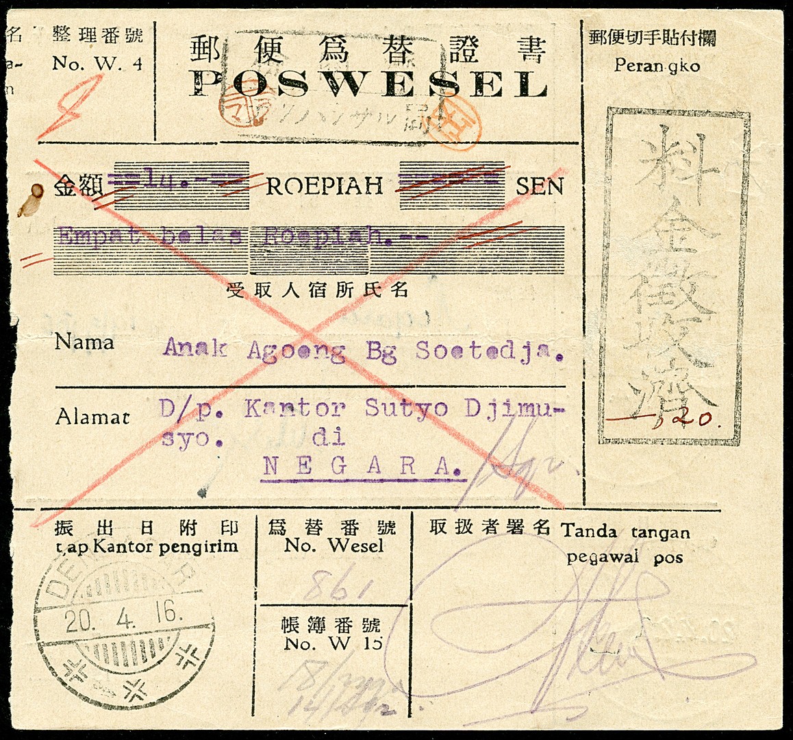 BALI. Postage Paid mark Bu.JB62 type F with written '-,20' on M.O. Bu.JF42 from Denpasar 20.4.16 to Negara 20.4.19. Censor Bu.JC3a from Denpasar. Ex Mattern