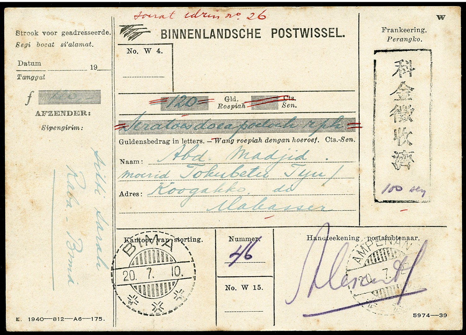 SOEMBAWA. Postage Paid mark in black with written '100 sen' Bu.JB61 type F on complete M.O. Bu.JF41a from the village Raba near Bima 20.7.10 via Ampenan 20.7.27 to Makasser (no arrival postmark)