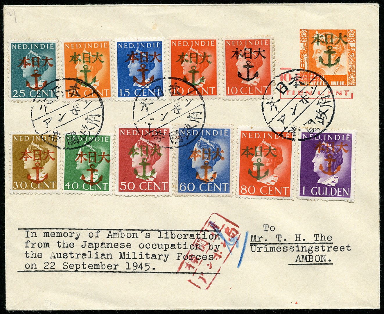 MOLUCCAS. Stationery envelope Bu.270 bearing eleven van Konijnenburg stamps with Bali anchor overprints, 'In memory of Ambon's liberation from the Japanese occupation by the Australian Military Forces on 22 September 1945.' made by the Ambon postmaster The for Australian soldiers. See: JR van Nieuwkerk, 'The Postal History of the Lesser Sunda Islands...', p.290-291