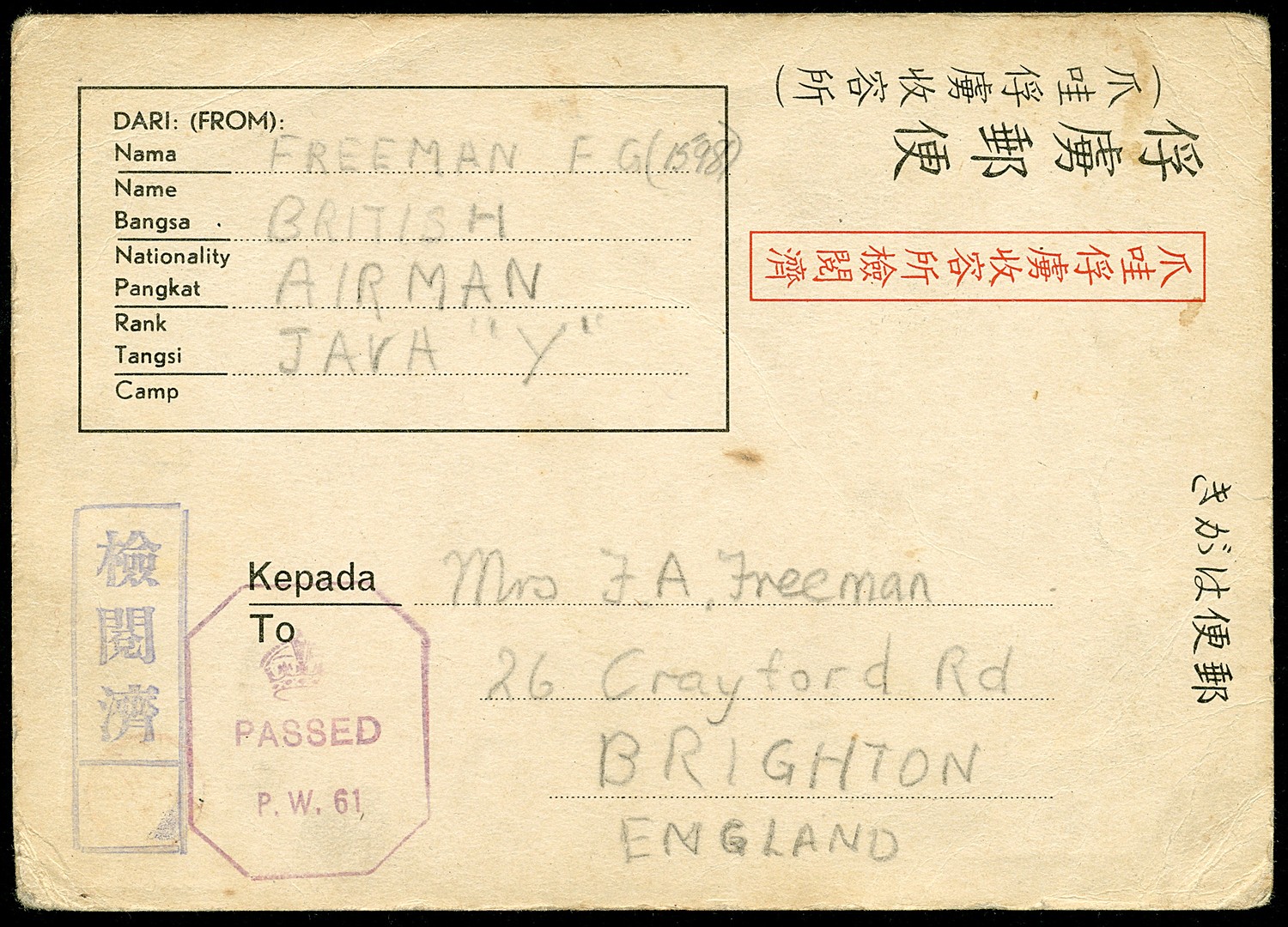 JAVA. POW card Bu.PW1 (undated) from a British POW in Camp Java Y to Brighton, England. Censors Vr.201b and British