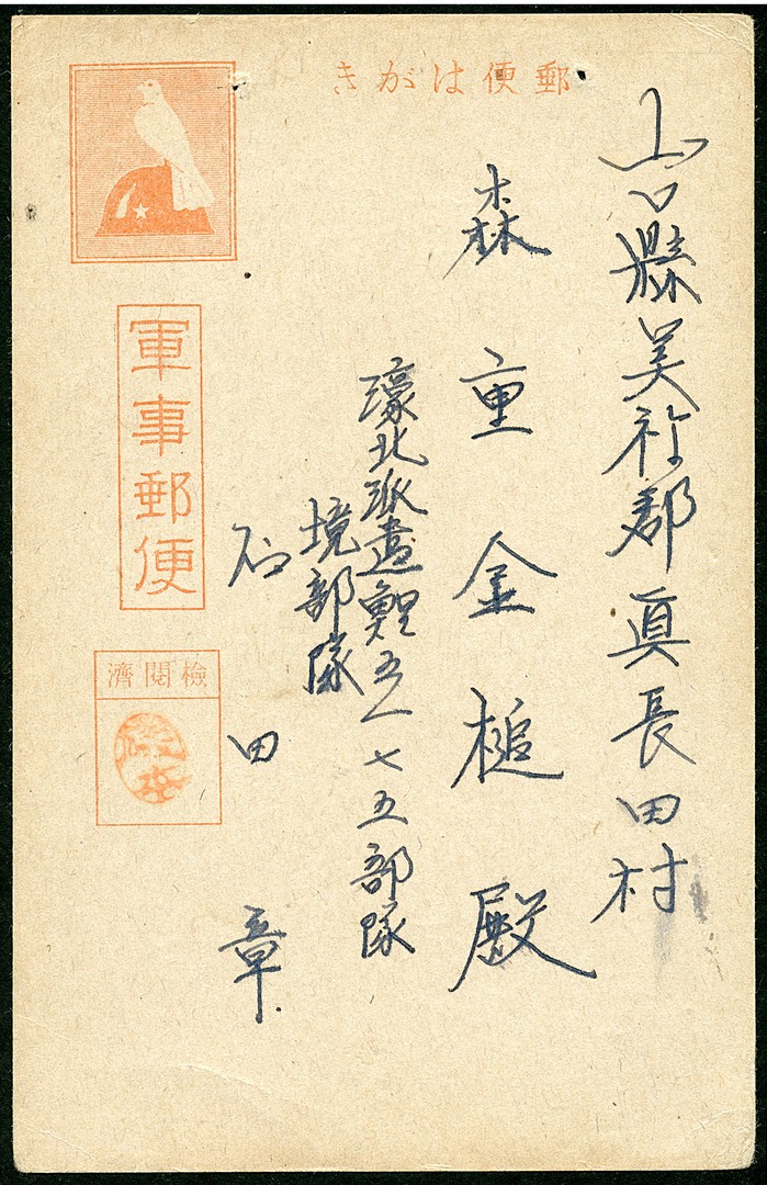 Japanese Military fieldpost card type 'Dove and Helmet' Bu.F22 (2 staples removed) from Unit 5175 (Sakabe Unit) in occupied Dutch New Guinea to Japan. Info added