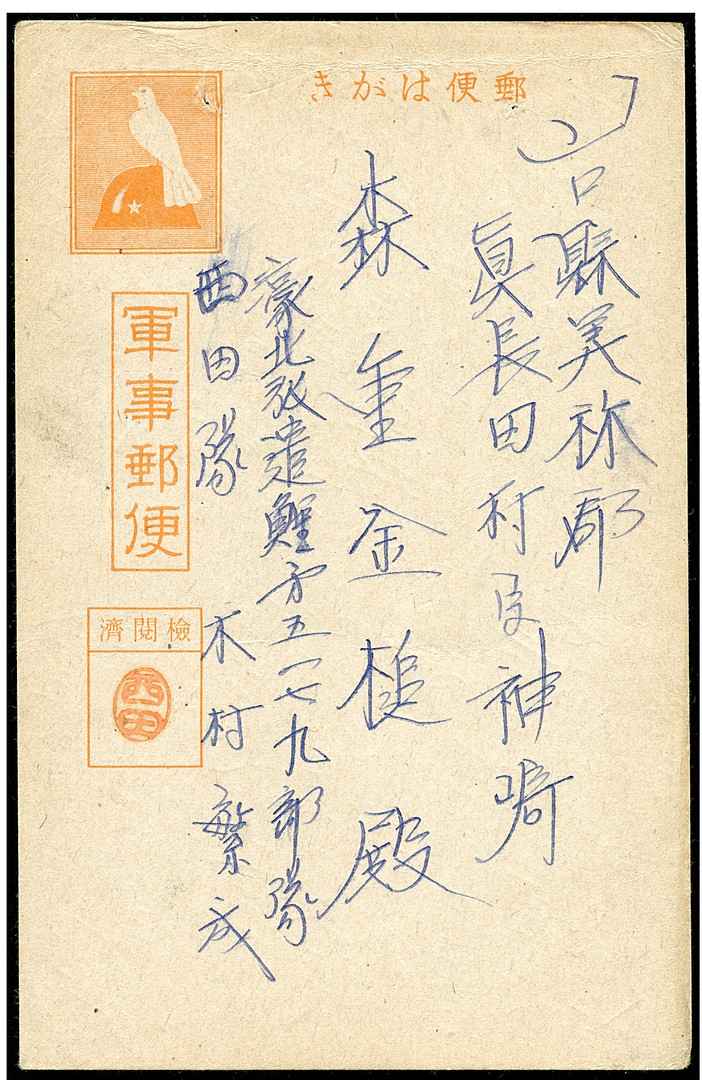 Japanese Military fieldpost card type 'Dove and Helmet' Bu.F22 (2 staples removed) from Unit 5179 (Nishida Unit) in occupied Dutch New Guinea to Japan. Info added