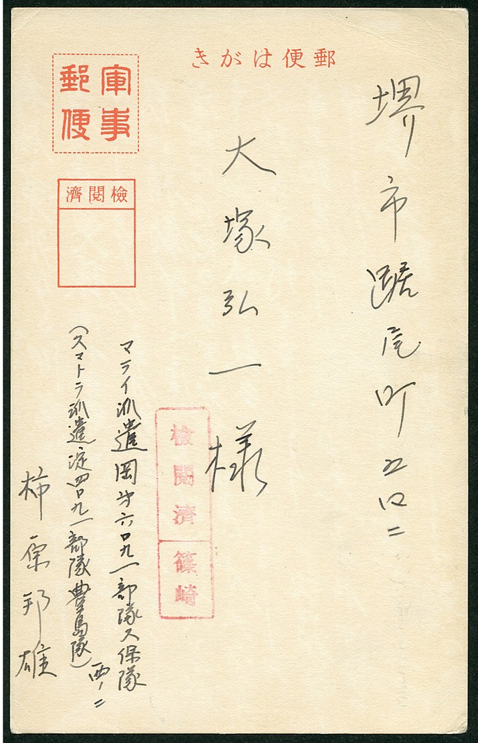 Postcard from a soldier, Yodo 4091, 4th Division, 1st Field Hospital, from Malaya to Japan (?)