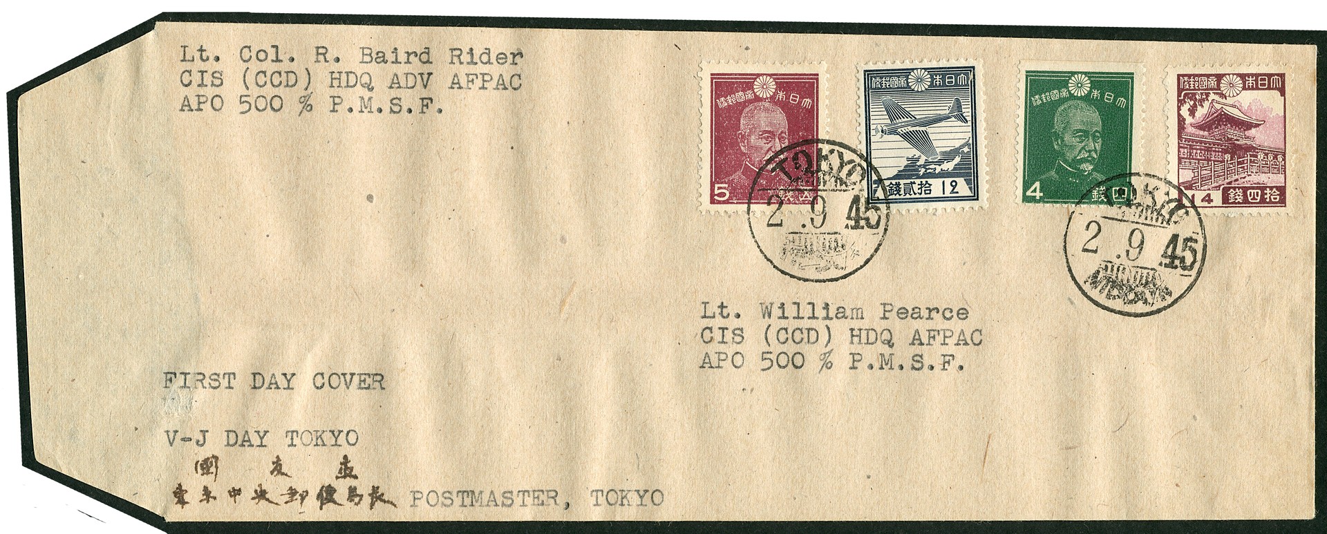 Philatelic cover Tokyo 2.9.45 obviously from the postmaster of Tokyo, typed 'First Day Cover' and 'V-J Day Tokyo'