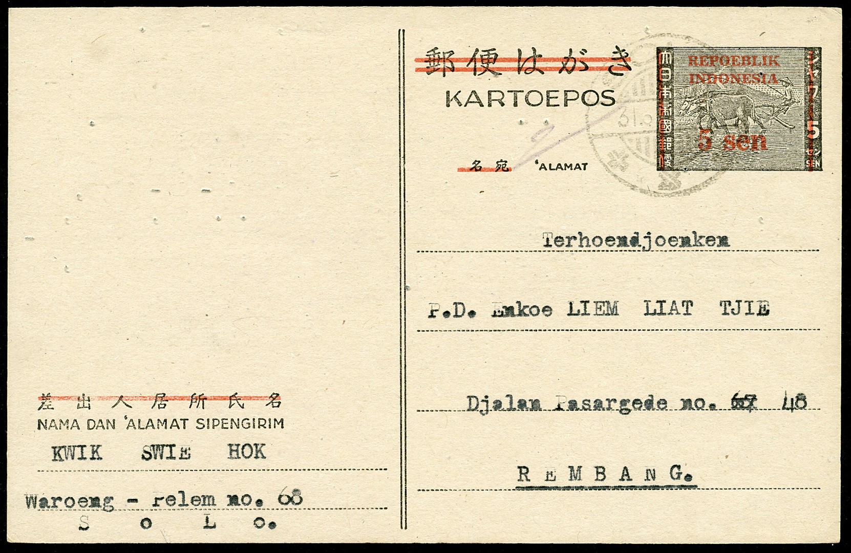 5 Sen postcard Bu.RJ1c (2x, from Djember 10.6.6.98 and Solo 31.1.6) and RJ2b (1x, Djakarta 2.3.06.11)