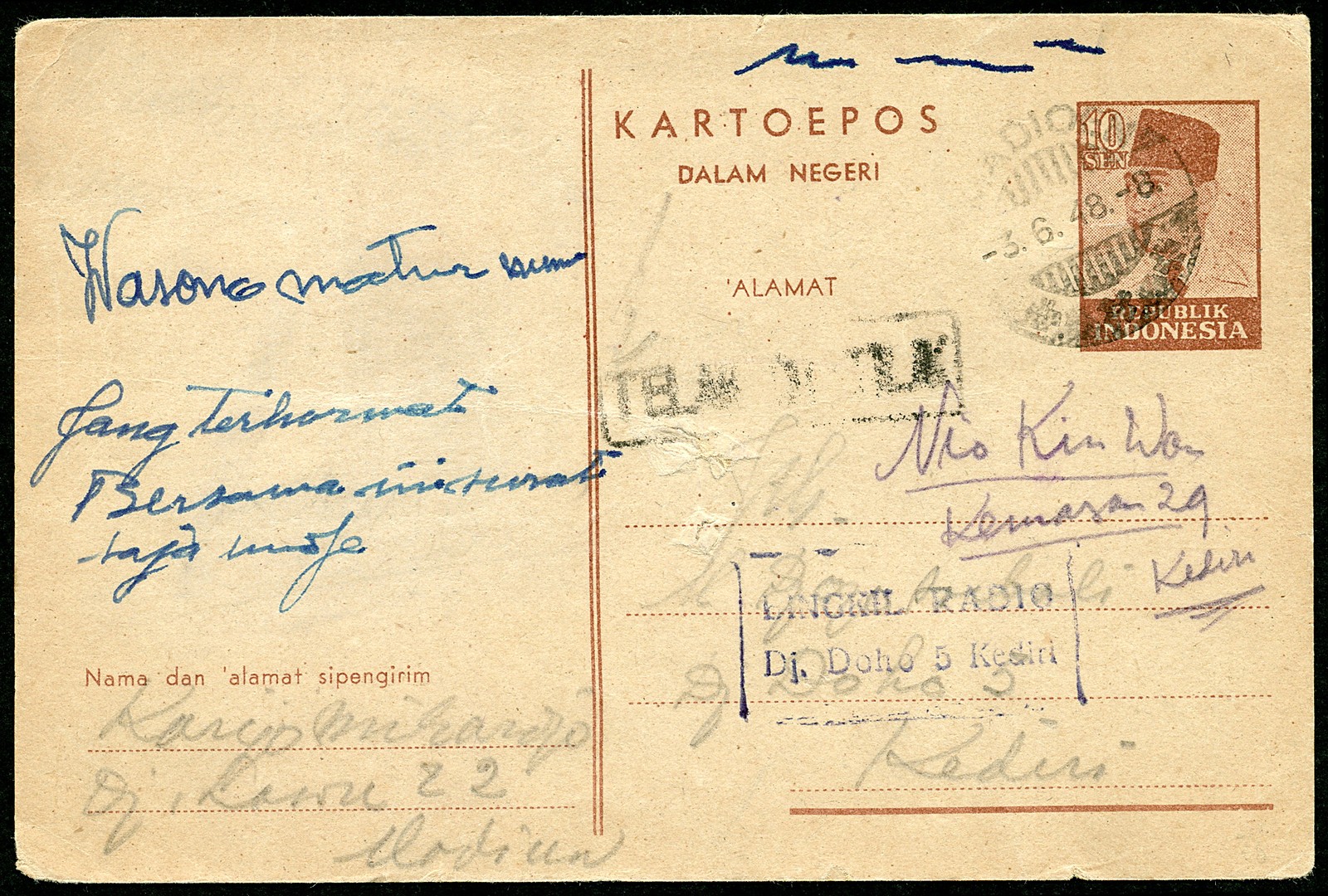 10 Sen postcard showing president Soekarno Bu.RJ22a from Madioen -3.6.48.-8 to Kediri. Censor Bu.RC1b (the blue framed cancellation is not postal)