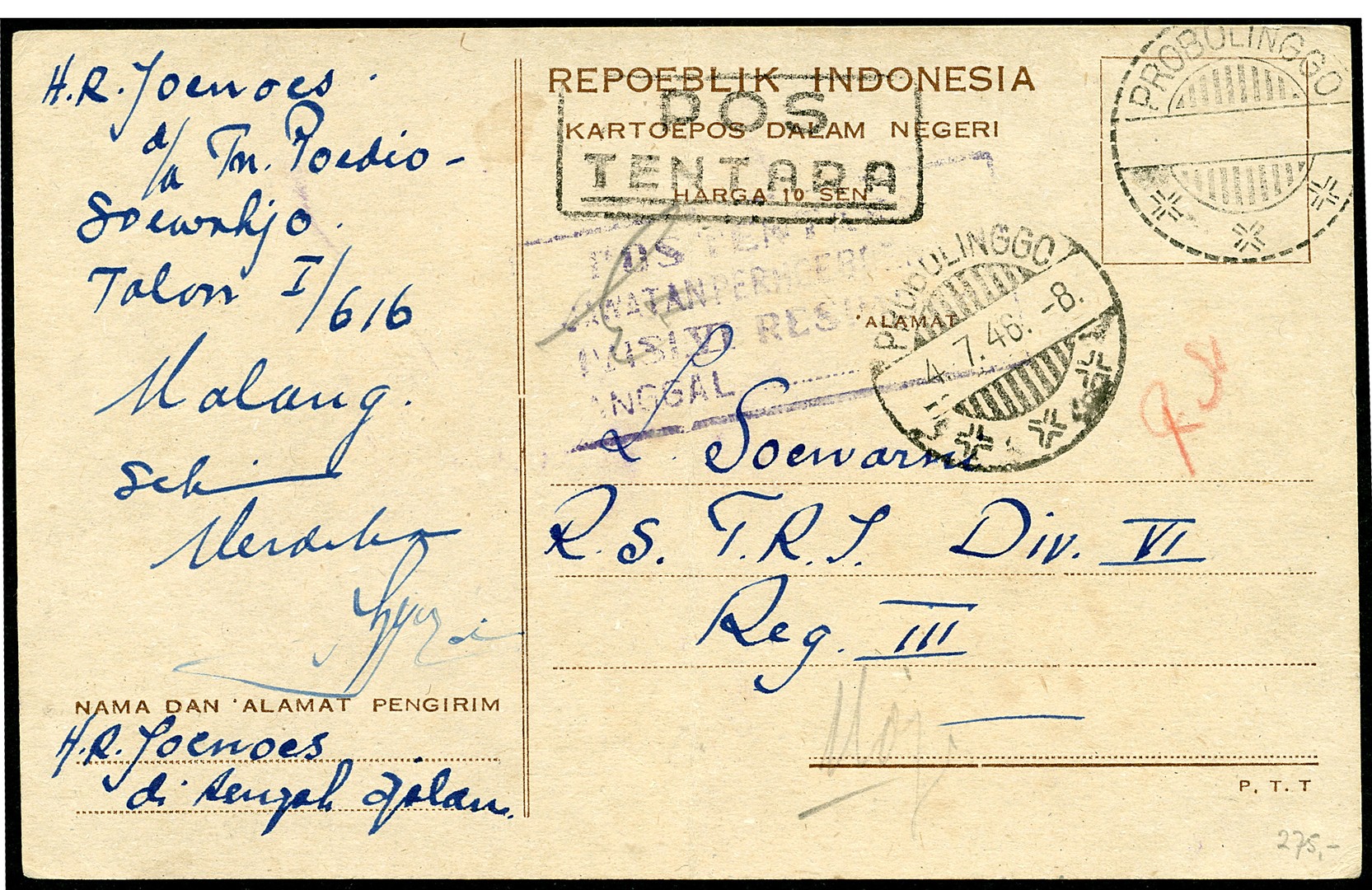 Ordinary postcard (10 sen) with open bar cancellation of Probolinggo Bu.RJ13 (crease) used as a field postcard showing framed 'POS / TENTARA' and framed division cachet in blue, from Probolinggo 4.7.46.-8 to a soldier of Division VI