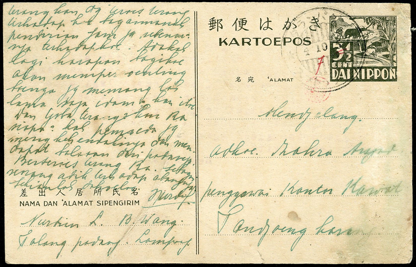 3½ Cent postcard with '3½' rate changed into '7' by two red pencil lines with small red initial handchop Bu.RS1, from Talangpadang 4.10.5 (type 220) to Tandjongkarang. Although the postcard has been a little wet, it is a rare item of which only a few have survived. Cert. 'Van Dieten 2006'