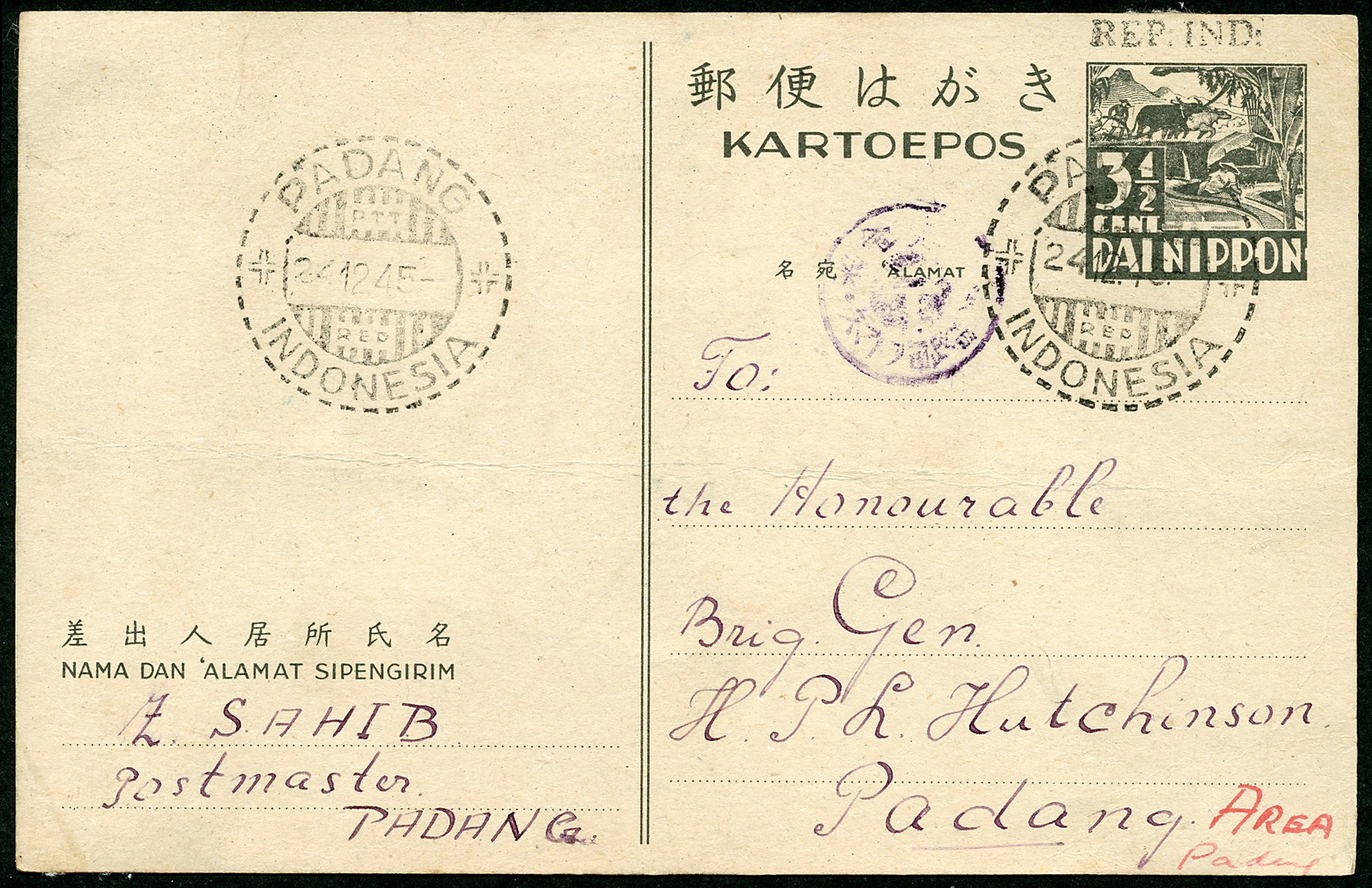 3½ Cent postcard with 'REP: IND:' and violet revaluation mark 'T' Bu.RS8, from Padang 24.12.45- (type 250) by postmaster Sahib with X-mas wishes to brigadier Hutchinson, in the 'Area Padang'
