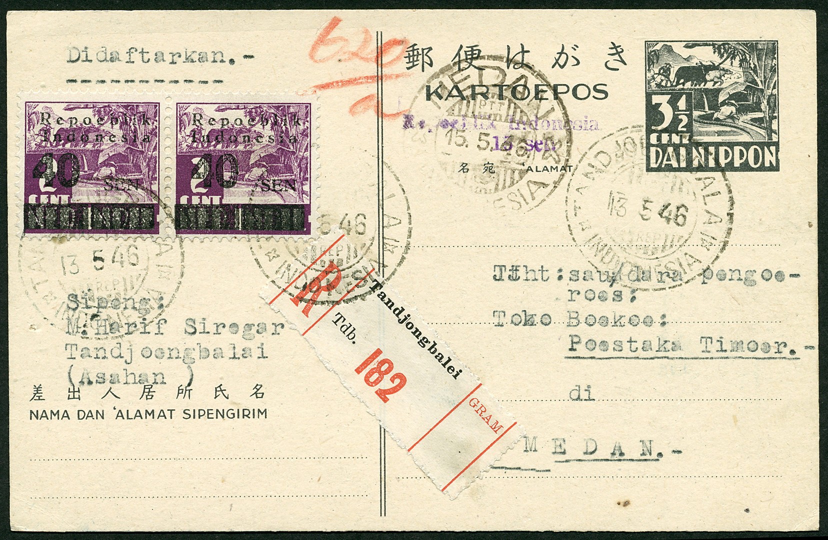 3½ Cent postcard with 'Repoeblik Indonesia / 15 sen' overprint in violet, bearing 2 cent Kreisler with overprint no. 0102 in pair (type 1 + 2) registered from Tandjoengbalai 13.5.46 (type 260) to Medan 15.5.46 (type 250). Registered postcards are quite rare (R-label 'Tandjongbalei')
