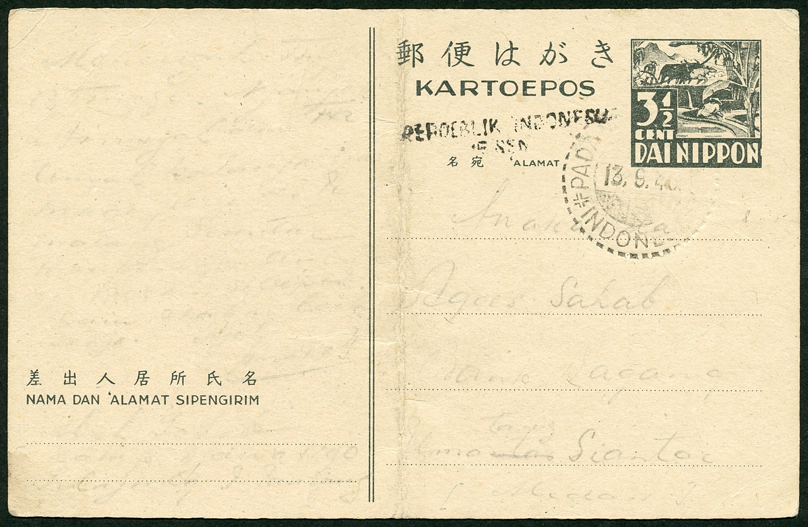 3½ Cent postcard with 'REPOEBLIK INDONESIA / 15 SEN' overprint (38 mm) Bu.RS27 (crease) from Padangpandjang 13.9.46 (type 260) to Pematangsiantar