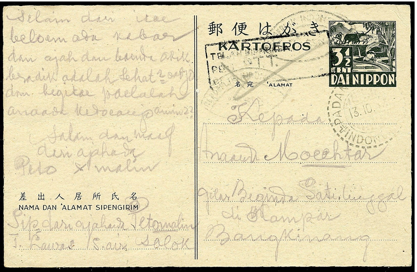 3½ Cent postcard showing two faint strikes of the oval 'REPOEBLIK INDONESIA / 75 SEN' overprint Bu.RS43b from Padangpandjang 13.10.47 (type 260) to Bangkinang. Censor Bu.RC26