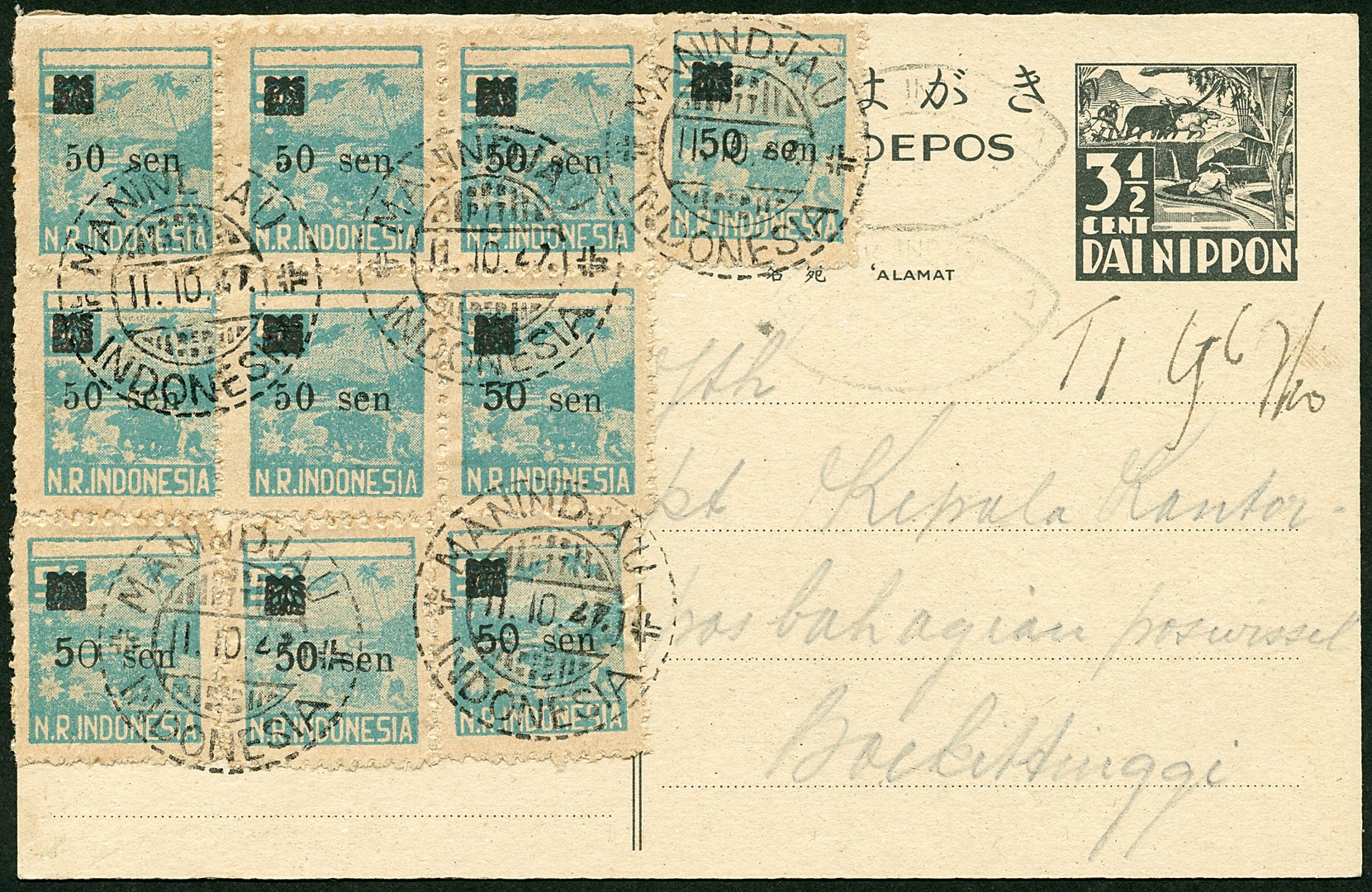 3½ Cent postcard showing two faint strikes of the oval 'REPOEBLIK INDONESIA / 75 SEN' overprint Bu.RS43b bearing 50 sen no. 0149 (10x and with two types '50') from Manindjau 11.10.47 (type 260) to Boekittinggi. A delightful card in very fine quality