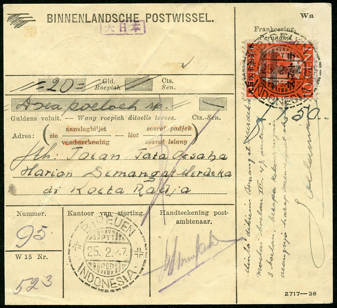 10 Cent van Konijnenburg with machine T and violet Indonesian overprint no. 221v-92z-43" and handwritten 'ƒ. 1,50' on light yellow M.O. Bu.RF31b (hardly visable crease) showing Dai Ni Hon overprint 82v from Bireuen 25.2.47 to Kotaradja 27.2.47. An extremely rare M.O. (Bu.RRR)