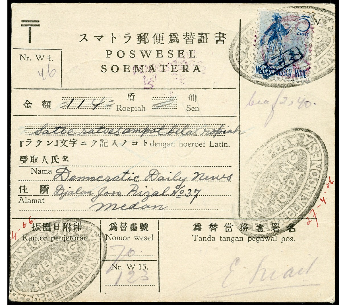 5 Cent dancer with blue Dai Ni Hon and violet P.T.T. Indonesia overprint no. 221v-822b-70 and written 'bea ƒ 2,40' on M.O. Bu.RF32 (white thick paper, crease) three times cancelled by the rare oval negative postmark MEMBANG MOEDA type 093 with in red written date '27-4-06' to Medan -4.5.46. Illustrated in vNV. page 82