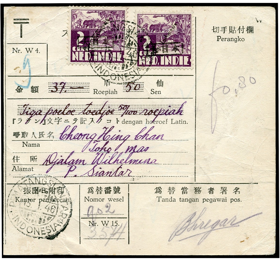 2 Cent Kreisler with black Dai Ni Hon and Rep. Indonesia overprint no. 211z-82z-16b (2x) and written postage 'ƒ 0,80' on M.O. Bu.RF32 from Pematangsiantar 15.1.46 sent locally
