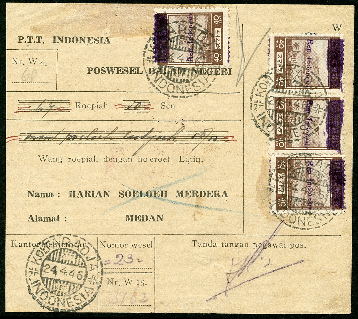 40 Cent definitive with ink brush stroke and violet Rep. Indonesia overprint no. 211v-95 (4x) on M.O. Bu.RF37b (lenght P.T.T. INDONESIA 32 mm) from Koetaradja 24.4.46 to Medan 21.5.-1. An extremely rare postal entire (Bu.RRR)