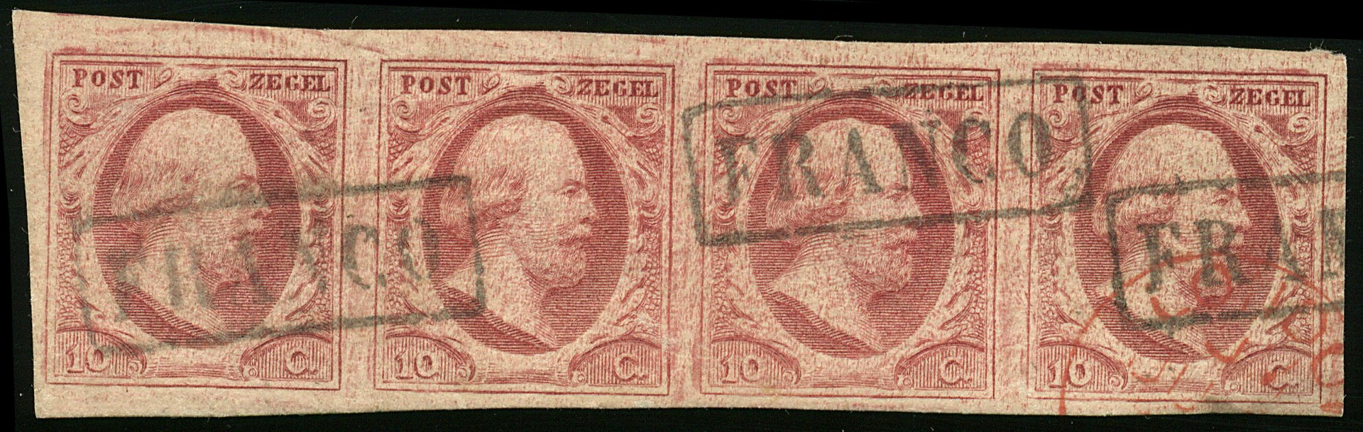 2l-Pl.VI-71/74. Breed gerande strip van vier, rechter zegel vlekje en ook gedeeltelijke afst. London. Strippen zijn zeldzaam!