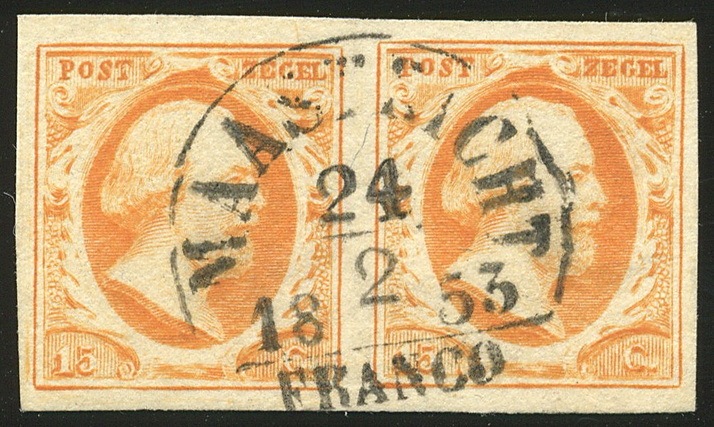 MAASTRICHT B (type 2, EY.125) op 15 cent nr. 3b, pos. 14/15. Mooi gerand prachtpaar met centrale afst.