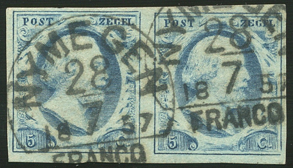 NYMEGEN C groot (EY.75) op 5 cent nr. 1f-Pl.II-17/18. Mooi paar met vooral op de linker zegel een luxe afst.