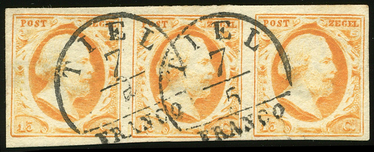 TIEL A (EY.125) op 15 cent. Prachtstrip van drie met twee complete afst.