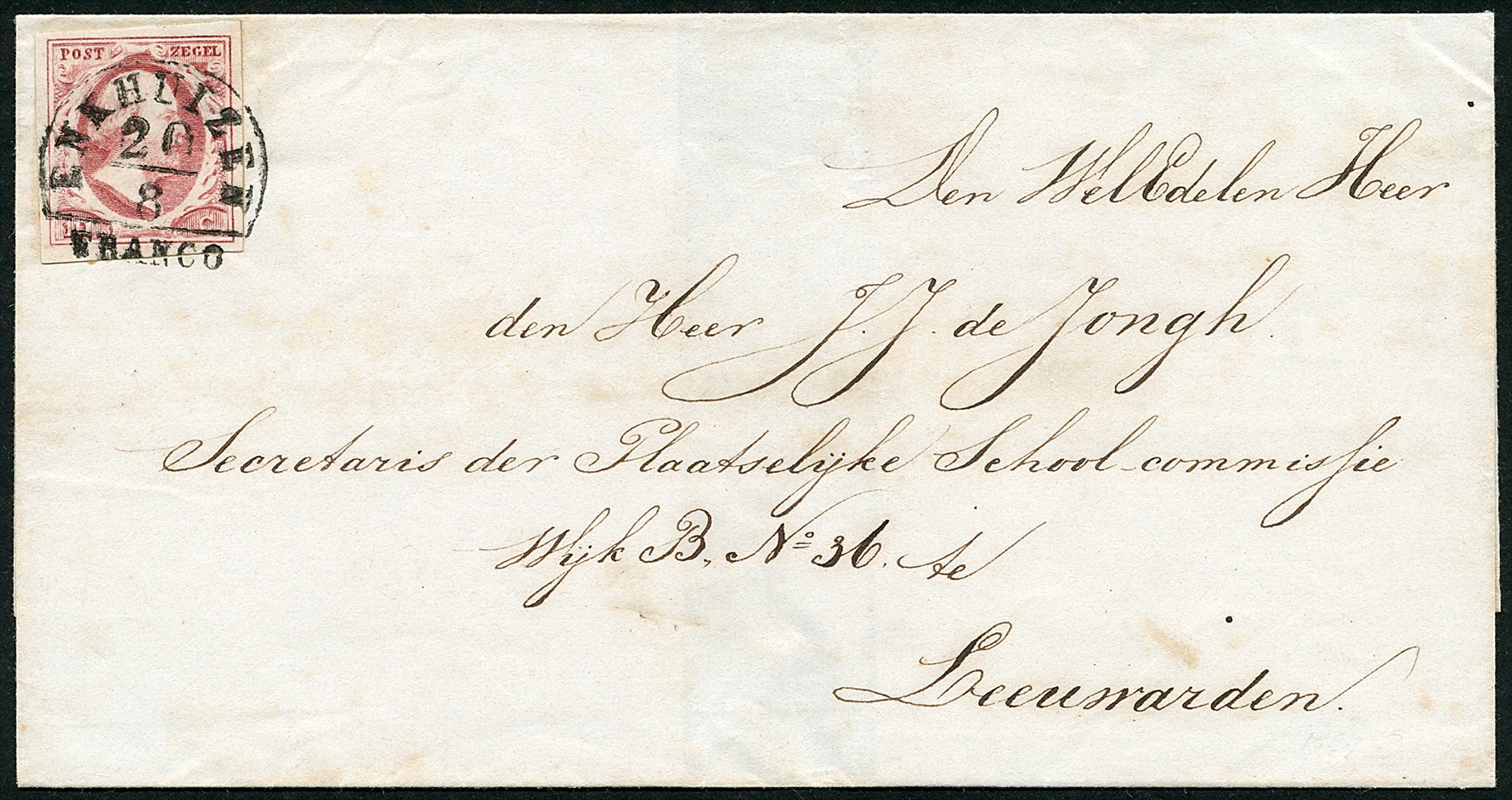 ENKHUIZEN A (EY.75) op 10 cent. Prachtex. met ideale afst. op briefomslag van 20-8-185? naar Leeuwarden 21-8