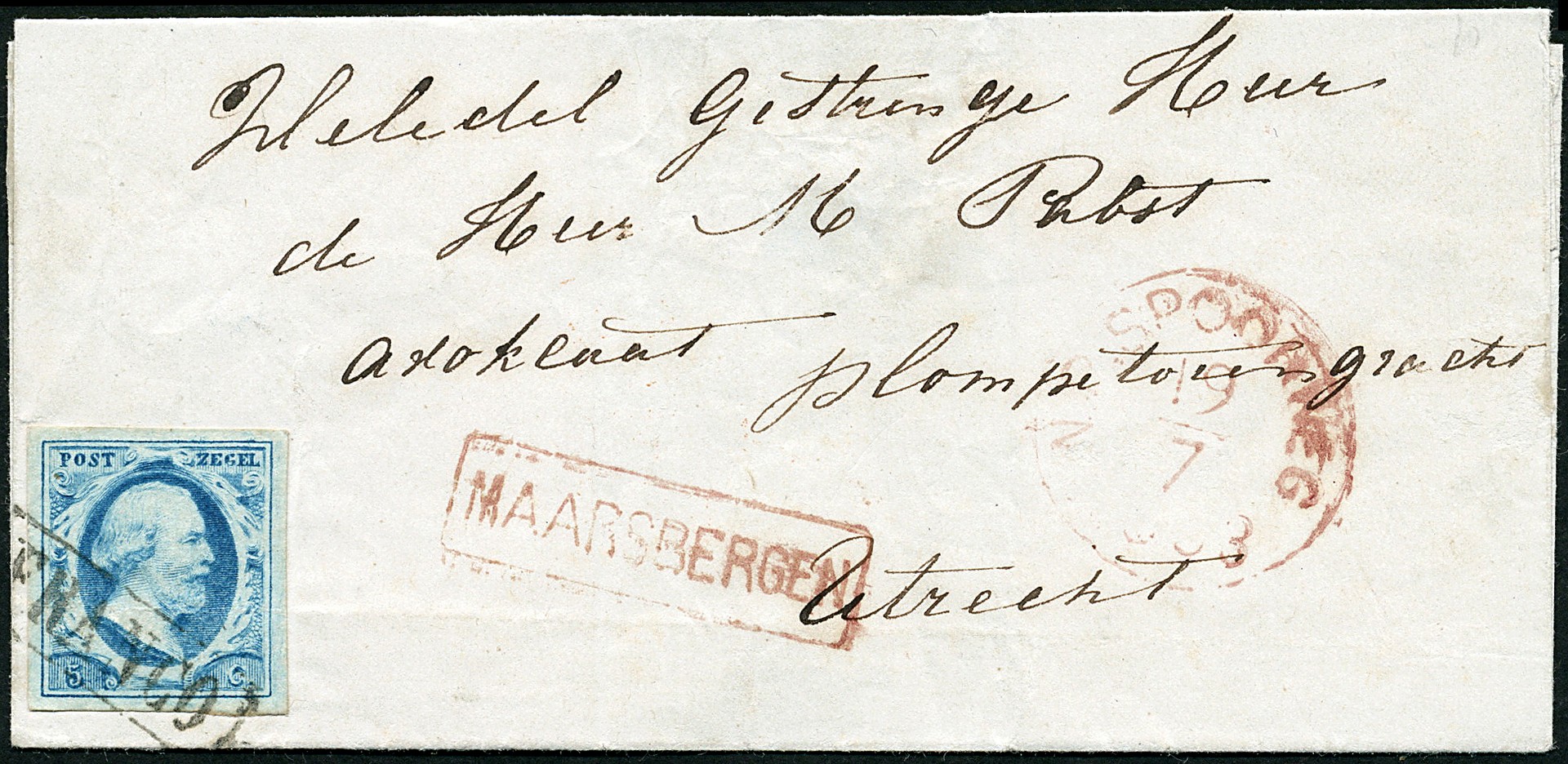5 Cent (zeer fraai ex. heeft nauwelijks zichtbare vouw) van de halte MAARSBERGEN (type K.70a) via de N.R.Spoorweg 19-7-1863 naar Utrecht 19-7