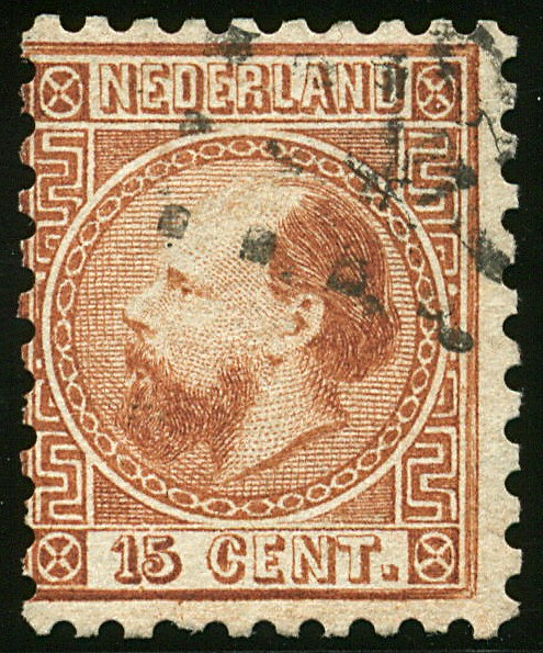 9IIB, 15 cent oranjebruin, kt.10½ x 10¼, type II, gebruikt prachtex. met cert. NVPH (1988) €.1500