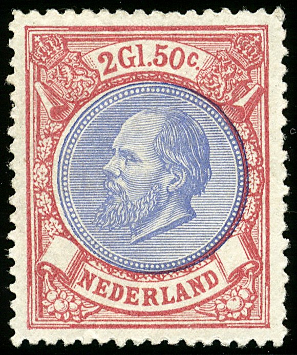 29, 2½ Gulden rood en blauw, goed gecentreerd en getand prachtex., vrijwel postfris €.1400