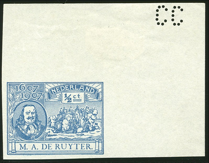 De Ruyter 1907. Kleurproef van de ½ cent in de gekozen kleur blauw, het rechter boven exemplaar uit het oorspronkelijke ongetande en ongegomde velletje van vier zegels, rechtsboven geperforeerd 'CC', PC.143a. Prachtex. en maar heel weinig aangeboden. Fl. 600++