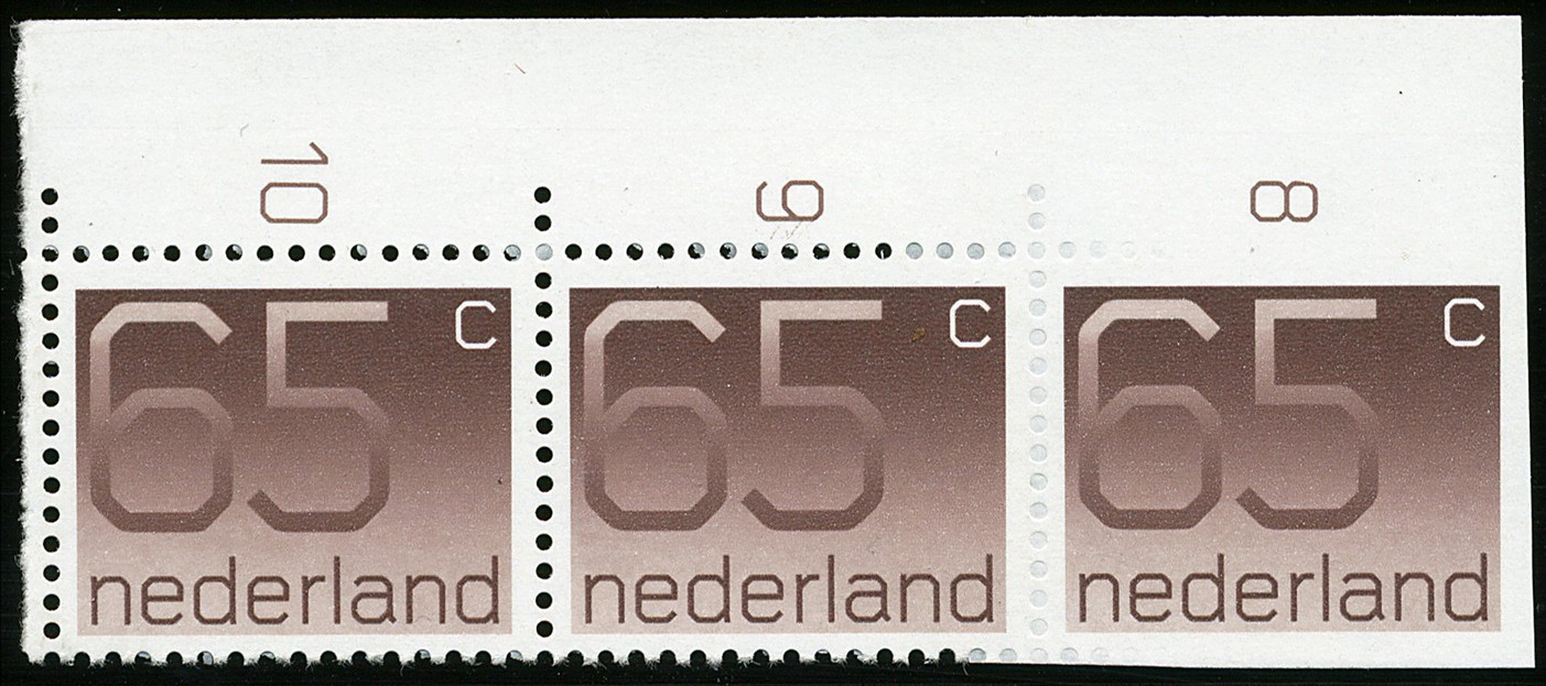 1116, 65 cent bruin in horizontale randstrip van drie, met het rechterex. met variëteit: geheel ongetand, postfris prachtex. €.-.-