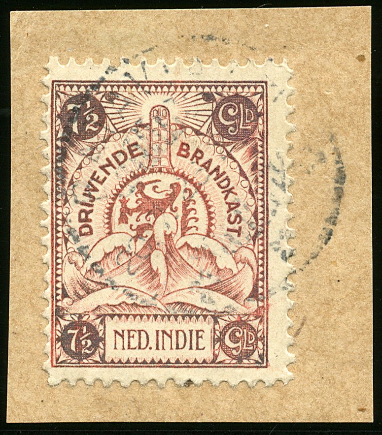 BK7, Brandkastzegel 7½ gulden op briefstukje met afstempeling Batavia 20.7.23.2-3n. Vrijwel prachtex. (iets geoxideerd). Echt gebruikt is zeldzaam! Keur 'Koopman'. € -.-