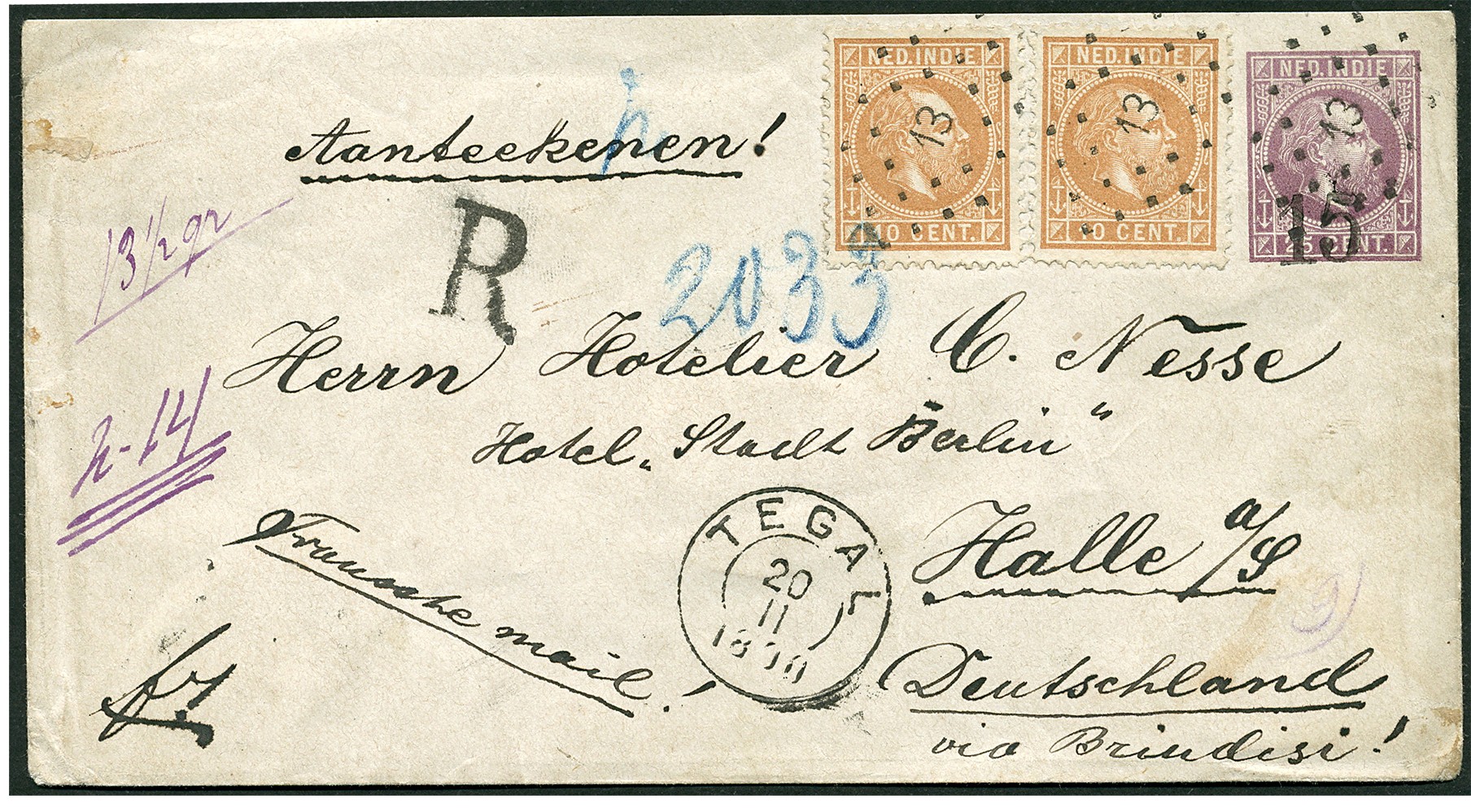 DUITSLAND. 10 Cent nr. 9F (2x) op env. G9a van 13½ gr. aangetekend van Tegal 20-11-1890 via Weltevreden 21-11 naar een hotelier te Halle 21-12