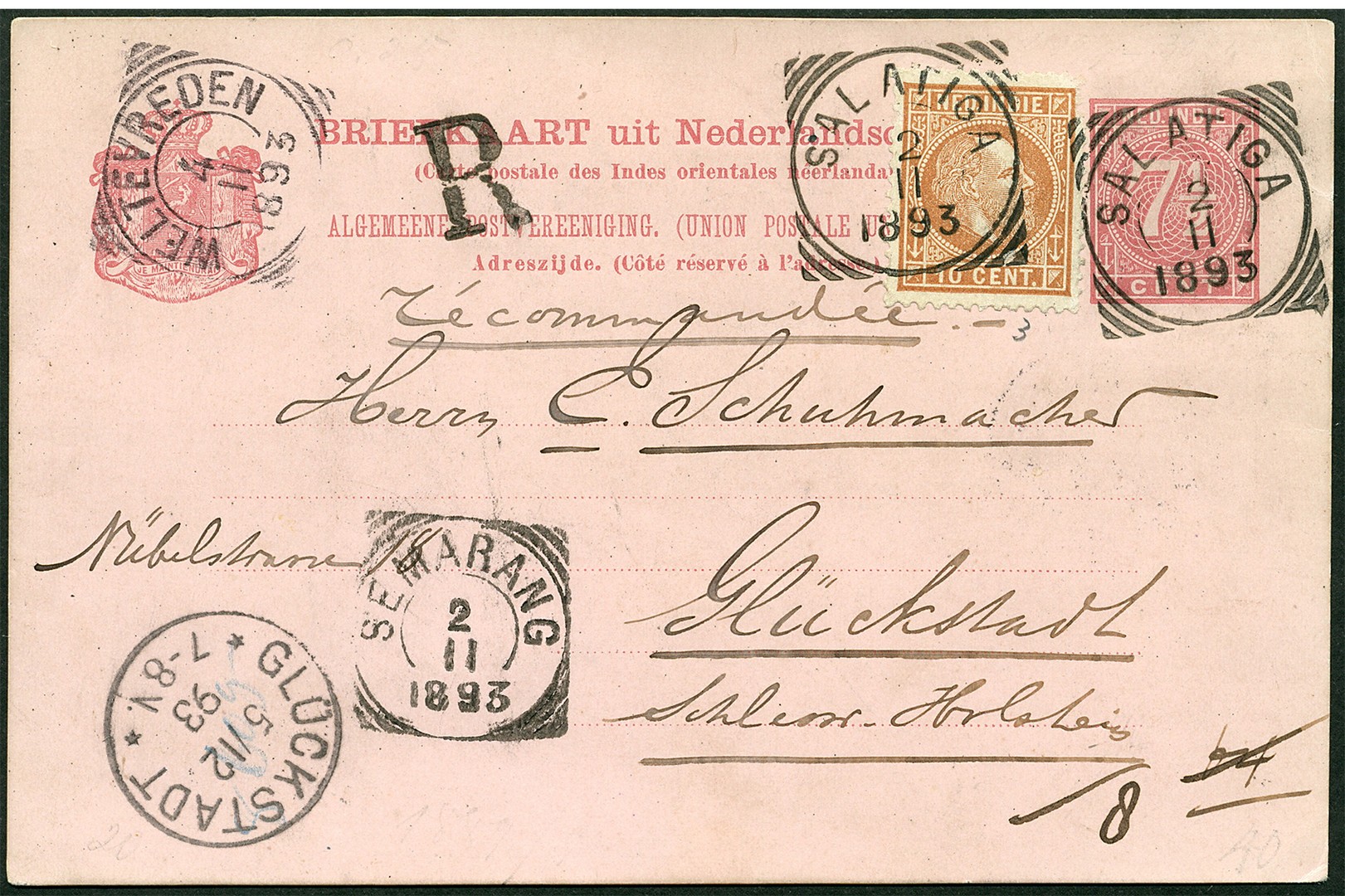 DUITSLAND. 10 Cent nr. 9K op bk. G12, aangetekend van Salatiga 2-11-1893 via Semarang en Weltevreden 4-11 naar Glückstadt 5-12. Tevens prentbk. met 4 mooie afb. uit Glückstadt (1896)