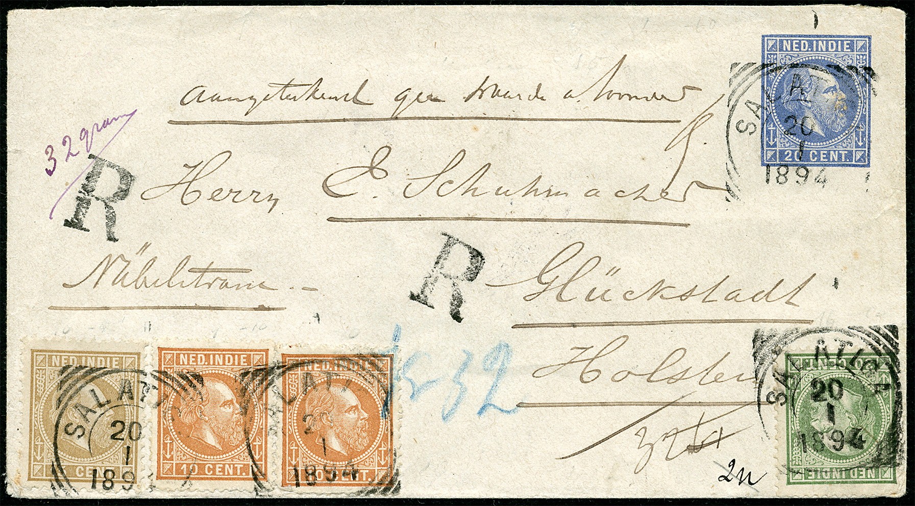 DUITSLAND. 10 Cent nr. 9K (2x), 15c nr. 11F en 30c nr. 14K op env. G2 van 32 gr. (port 3x 25c), aangetekend van Salatiga 20-1-1894 via Semarang en Weltevreden 23-1 naar Glückstadt 21-2. Zeldzame en mooie 4-kleurenfrankering