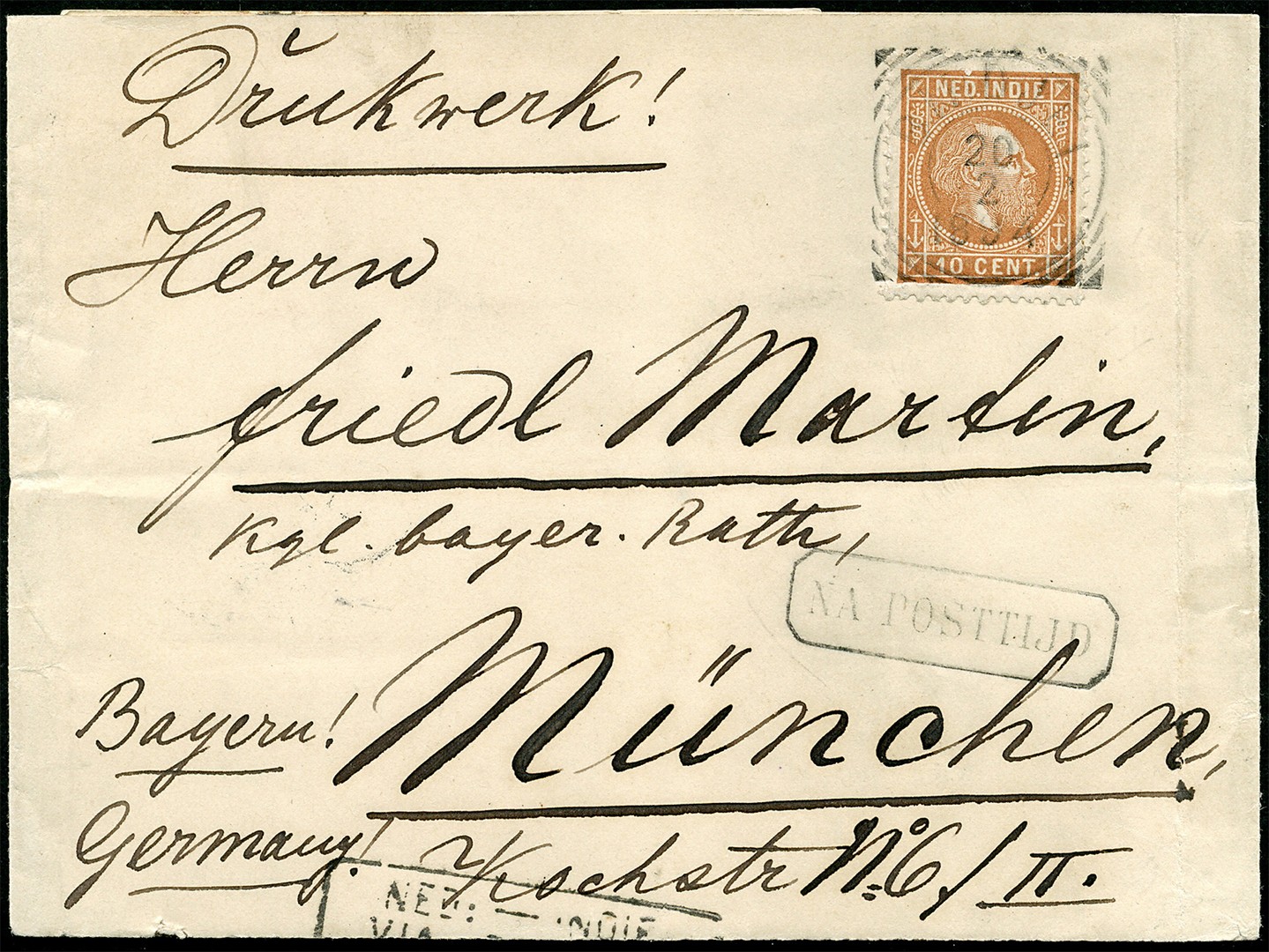 DUITSLAND. 10 Cent nr. 9K op omslagbandje van een drukwerk tussen 50-100 gr. van Bindjei 20-2-1894 via Medan en de N.I.Postagent Penang 22-2 naar München 17-3. Op vz. tevens 'Na Posttijd' en fragment routestempel. Schaars!