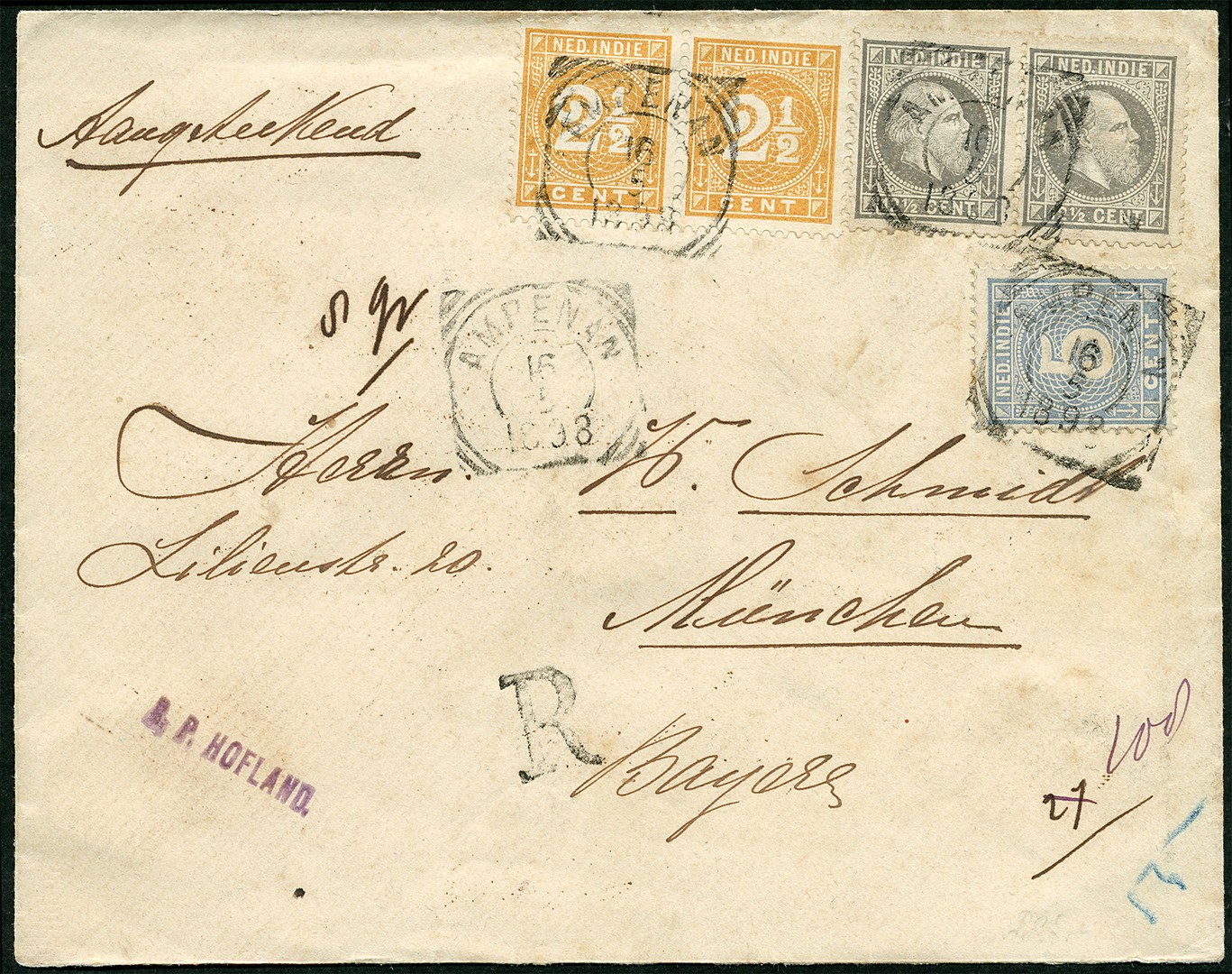 DUITSLAND. 12½ Cent nr. 10H in paar, 2½c nr. 19D in paar en 5c nr. 22Da op env. van 8 gr. aangetekend van Ampenan (op Lombok) 16-5-1898 via Soerabaja en Weltevreden 23-5 naar München 19-6. Mooie 3-kleurenfrankering!