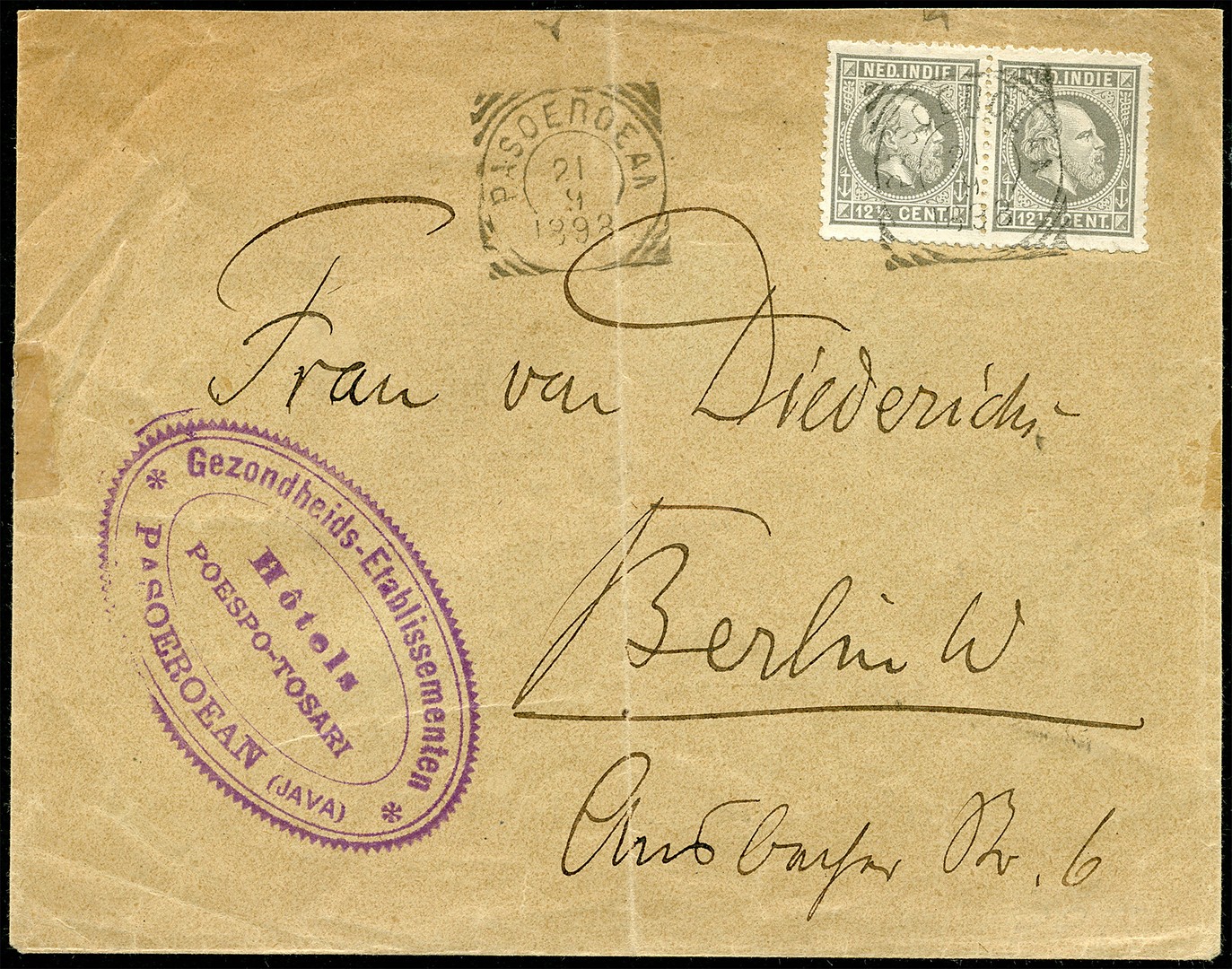 DUITSLAND. 12½ Cent nr. 10H in paar op env. (vert. vouw, az. mooi bedrukt) met fraai afzenderstempel van hotels in paradijselijk gelegen oorden, van Pasoeroean 21-9-1898 via Soerabaja en Weltevreden 23-9 naar Berlijn 27-10