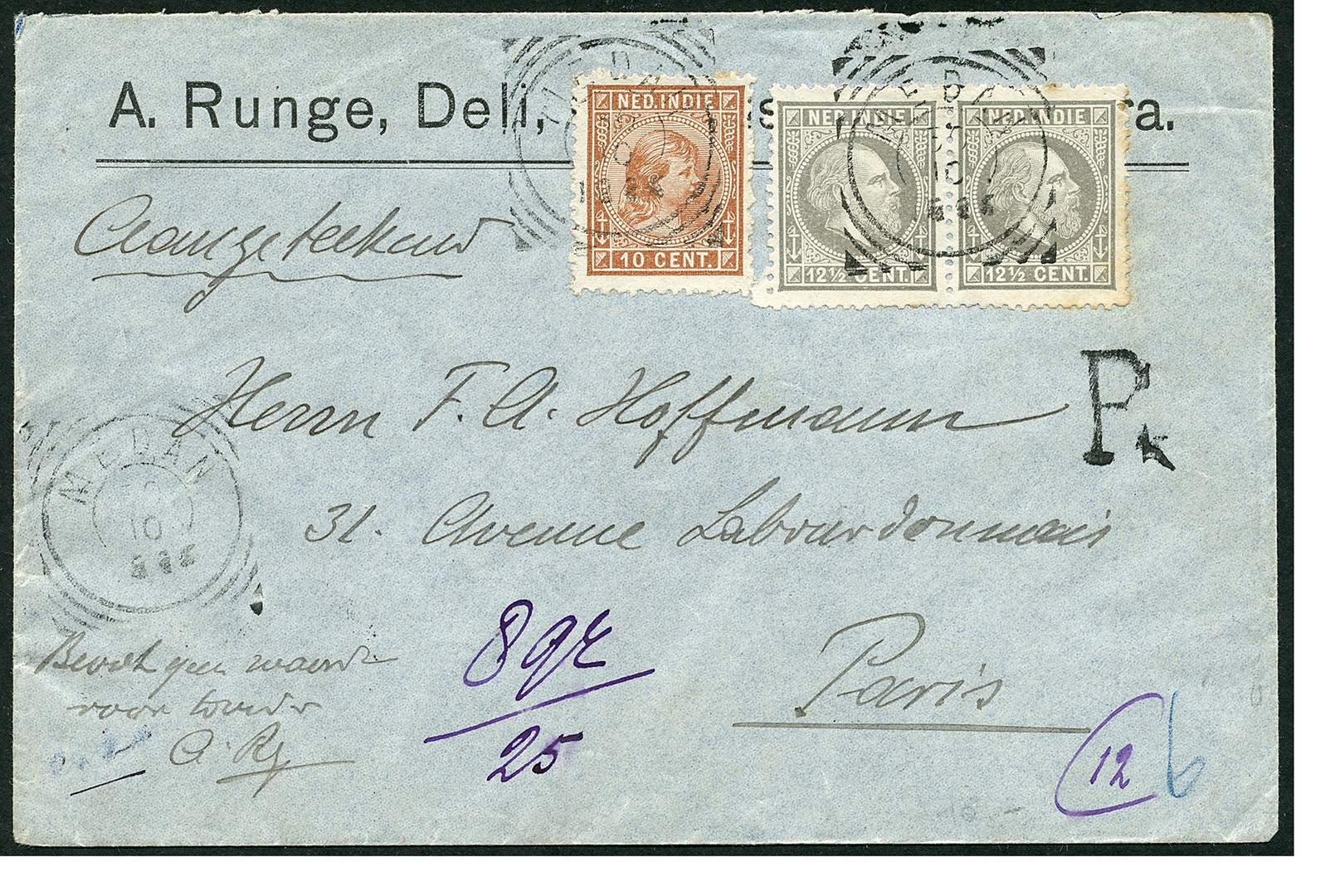 FRANKRIJK. 12½ Cent nr. 10H in paar en 10c nr. 23 op bedrukt couvert van 8 gr. aangetekend van Medan 30-10-1895 via de N.I.Agent Singapore 2-11 per Franse pakketboot Nr. 3 van de Ligne N 5-11 verder naar Parijs 25-11. Mooie mengfrankering!