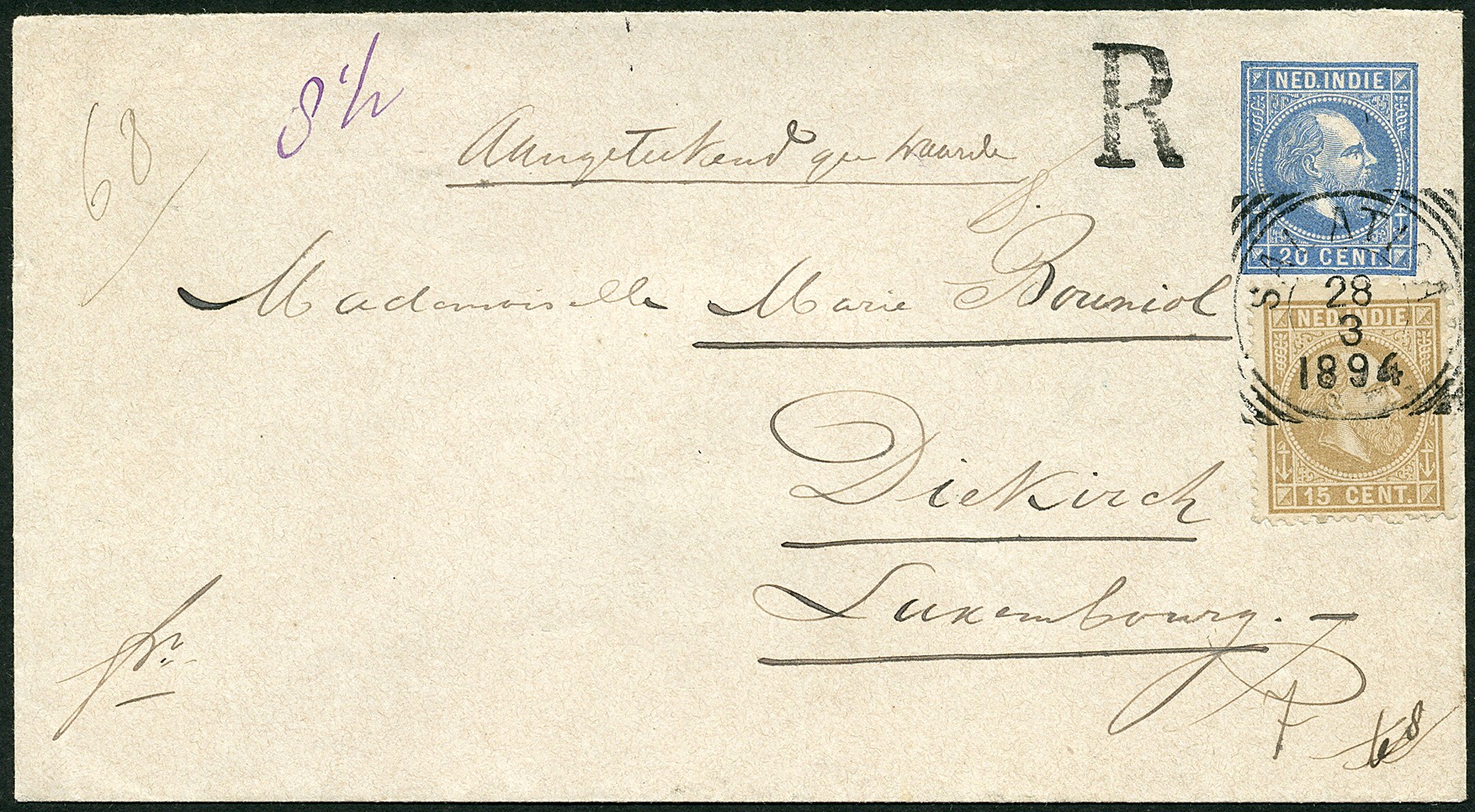 LUXEMBURG. 15 Cent nr. 11F op env. G2 van 8½ gr. aangetekend van Salatiga 28-3-1894 via Semarang en Weltevreden 31-3 over Luxemburg 2-5 naar Diekirch 2-5. Luxemburg is een buitengemeen zeldzame bestemming en door ons uit die tijd nog niet eerder gezien!