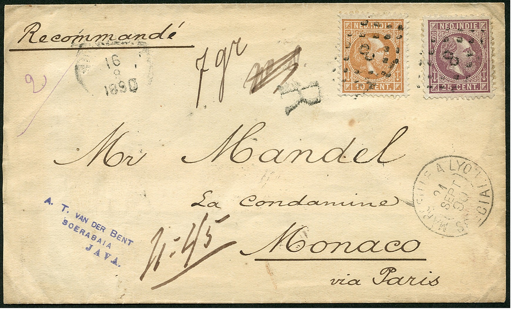 MONACO. 10 Cent nr. 9F en 25c nr. 13F op env. van 7 gr. aangetekend van Soerabaja 16-8-1890 via Weltevreden en diverse Franse spoorwegtrajecten o.a. Marseille à Nice 22-9 naar Monaco. Zeldzame bestemming!