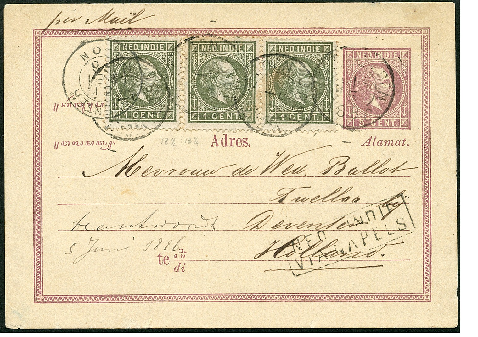 NEDERLAND. 1 Cent nr. 4E (3x w.o. in paar, rechter ex. fraai) op bk. G1d van Weltevreden 1-5-1886 via Napels en Deventer 31-5 naar Twello. Mooie kaart, ½ cent overgefrankeerd (beslist geen maakwerk!)